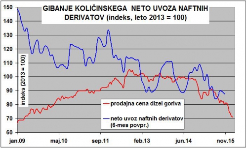 Za podkrepitev teh dilem je v naslednjem grafikonu prikazano gibanje cen dizelskega goriva zadnjih petih letih (indeks, 2013 = 100), vzporedno pa ocena o potrošnji naftnih derivatov. Uporabljen je podatek o neto uvozu (uvoz minus izvoz) in sicer 6-mesečne drseče sredine. Kot vemo je cena goriv naraščala do leta 2013, v zadnjem letu in pol pa se je znižala kar za 30 odstotkov. Ne glede na ta gibanja, pa se količinska potrošnja naftnih derivatov vse obravnavano obdobje postopno znižuje. Seveda gre pri tem za skupek različnih vplivov, a s precejšnjo gotovostjo lahko trdimo, da se potrošnja derivatov v zadnjem letu kljub močnemu znižanju cen (30 %) ni povečala, dejansko se je celo znižala. Zaradi tega je ocena, da bi le 5 % rast cen povzročila kar 7 % znižanje porabe, zelo vprašljiva. V oceni UMAR-ja je namreč upoštevana cenovna elastičnost s faktorjem – 1,3 do – 1,5, a gibanja v zadnjem letu temu vsekakor ne pritrjujejo.