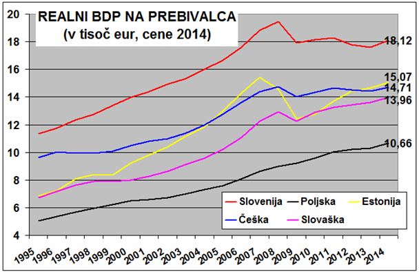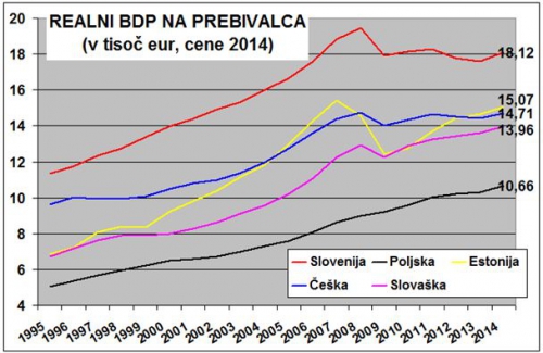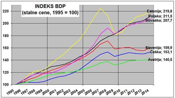 Pred časom smo lahko prebrali kolumno uglednega avtorja o zaostanku Slovenije v gospodarskem razvoju in prehitevanju s strani nekaterih nekdanjih vzhodnih držav. Za podkrepitev teze avtor navede nekaj statističnih podatkov in sicer, da naj bi Estonija v zadnjih 20 letih svoj BDP povečala kar za 570 odstotkov, Češka na primer za 240 odstotkov, Slovenija pa le za 129 odstotkov. Da je bil padec našega domačega proizvoda v času krize kar nekaj višji kot v primerljivih državah, seveda ni nobenega dvoma in vsesplošni konsenz je tudi v ugotovitvi, da je to posledica predvsem neustrezne ekonomske politike v širšem smislu. Ne glede na to poenotenje, pa je pri navajanju številk vseeno potrebno uporabiti točne in primerljive podatke. Omenjeni podatki so namreč nominalne stopnje rasti BDP, ki seveda ne odražajo dejanskih razlik med državami in so v tem pogledu zavajajoče. Zato v nadaljevanju nekaj konkretnih statističnih podatkov o gibanju bruto domačega proizvode Slovenije v primerjavi z nekaterimi drugimi državami (vir je Eurostat in OECD). Torej samo prikaz gibanj, brez namena kakih poglobljenih komentarjev.