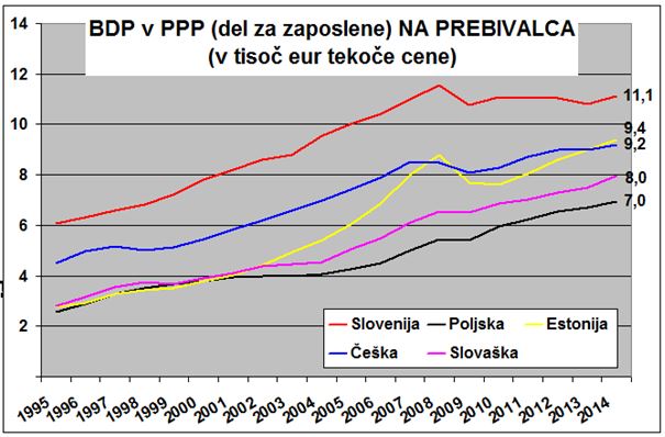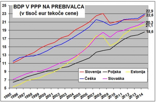 Po tem kazalcu je BDP na prebivalca na Češkem že od leta 2011 celo nekoliko višji kot v Sloveniji, a zanimivo je, da je bilo takšne razmerje že pred dvajsetimi leti. Kasneje smo jim za nekaj časa »ušli« in vse do nastopa krize je bil tako izračunan BDP v Sloveniji kako desetino višji kot v Češki. Precej hitreje pa se nam približujejo ostale tri navedene države, posebno po letu 2008 in danes je tega zaostanka le še med 10 in 20 odstotkov. A omenimo lahko, da je bilo predlansko leto po dolgem času prvič, ko je bila rast tako izračunanega primerljivega BDP v Sloveniji višja od vseh navedenih držav (ter tudi od vseh ostalih članic EU).