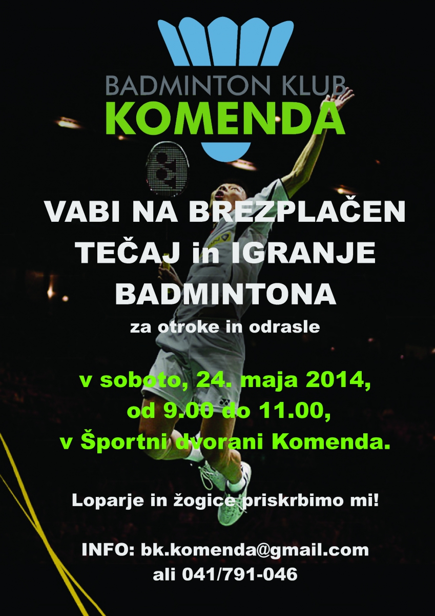 V okviru občinskega praznika Komenda v soboto, 24.5.2014 ob 9h organiziramo "tečaj in igranje badmintona za otroke in odrasle". Prireditev se bo odvijala v Športni dvorani Komenda.