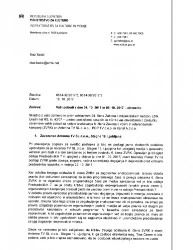1. Dne 4.10.2017 sem zaradi grobega cenzuriranja dveh od devetih kandidatov Inšpektoratu za kulturo in medije prijavil Planet TV, točneje Antenna TV SL, d.o.o.
