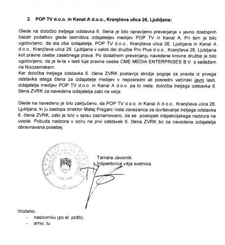 2. Dne 9.10.2017 sem zaradi dejstva, da TV postaja z največjim številom gledalcev v Sloveniji, POP TV, sploh ni javno objavila pravil, kakor jih nalaga 1. odstavek 6. člena ZVRK.