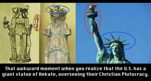 Zame je dokaz gornje trditve severnoameriški kip Svobode, ki je svoboda samo za globalistično elito, katere del med drugimi ni samo bilderbergovski manipulator Obama, ampak tudi v demokraturni plašček preoblečeni bivši kgb-jevec, v bistvu pa nacionalkomunist Putin, že mrtvi komunistični diktator J. B. Tito, pa seveda vsi papeži. Tudi francoski prostozidarji so s kipom Svobode, darilom za svoje ameriške kompanjone, kopirali simbole mediteranskih antičnih ideologij, da se ve, da so tudi oni, masoni, na pravoverni liniji vzpostavitve globalne elitistično totalitarne države, tako kot Vatikan in njegova katoliška cerkev. Da ne govorimo o tem, da je boginja Hekata boginja čarovništva in podzemlja ter zaščitnica Magije. To brez dvoma veliko pove tudi o pravi vsebini katolicizma in masonerije.
