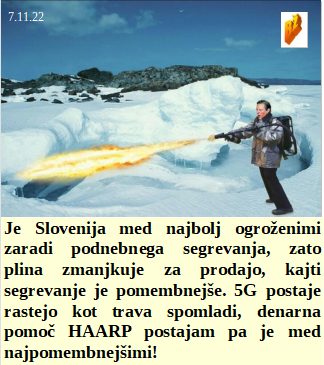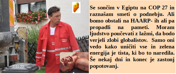 Zelo se trudi naša oblast, da smo med najbolj ogroženimi zaradi podnebnega segrevanja. Tudi v Iranu so Ameriški izdajalci, pa celo ženske. Slovenska vlada odločno podpira nacizem v Ukrajini. Seveda je Pahor moral na sončenje v Šarm el Šejk, saj je to pogoj za ohranitev dobrega suženjskega odnosa z gospodarji.
