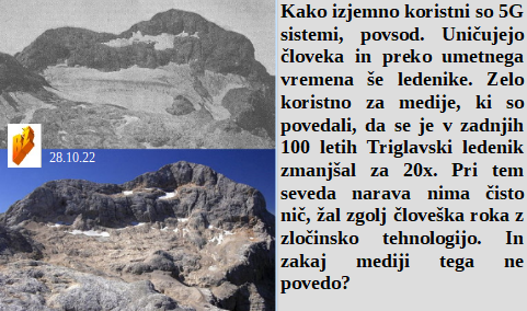 Kako naravno se topi Triglavski ledenik, s 5G še pospešeno. Kitajci hočejo poneumiti svet in mu pokazati kako - z 800 tisoč zaprtimi. Kakšne podnebne spremembe, kakšen kovid, kakšno zapraševanje. So milijarderji dokončno prevzeli Anglijo in jo bodo odpeljali v svet belega suženjstva.