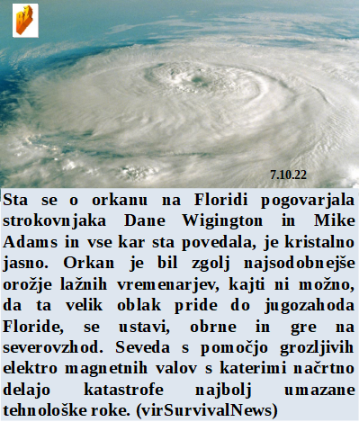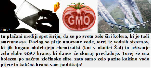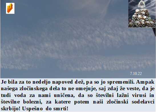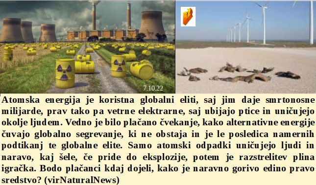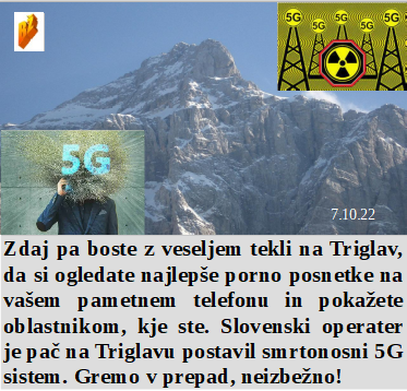 Včasih je bilo veselje in ponos iti na Triglav, zdaj bodo šli med 5G sistem res samo norci. Najbrž samo pri nas lahko poleg minsitrskega opravljaš še honorarno delo? In nova bolezen naj bi se širila zaradi pitja umazane vode? Zelo koristno za planet je uporabljati atomsko energijo, saj ustvarja ogromno škode. Iz deževne napovedi kar naenkrat v sonce, ampak plinsko risanje po nebu ostaja in škoduje povsem enako. Da je bil Orkan na Floridi prirejen ni nobenega dvoma.