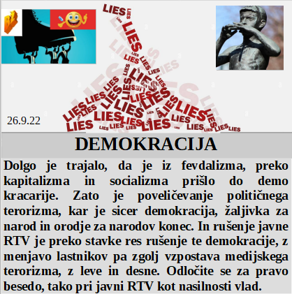 Stara resnica o nadziranju ljudstva. Na RTV črni ekran in pred njim novi župnik. Elita je začela celo tržnice sežigati, hrane ne sme biti. Demokracarija ali sestavljanka laži. Se zaporniški sindikat pritožuje nad preobremenjenostjo, kaj pa, ko pridejo sedeti množice politikov? In sam sebi všeč lepotec je zvezda pri eliti.