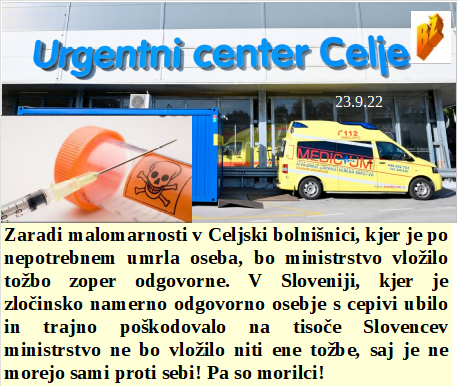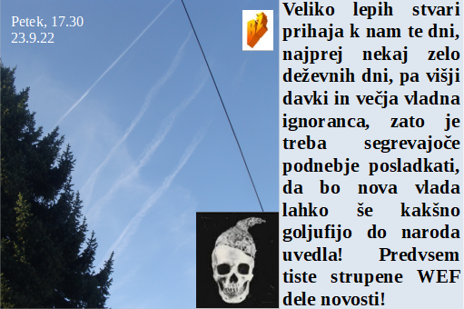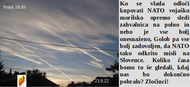 Nekoč novinarji nismo lagali, danes je čas preživetja za njih. Po malomarnosti v Celju umrla ena oseba, zločinsko zlonamerno pa veliko! Ker sladkanje vlada rabi, je dovolila posladkati nebo. NATO pa se je v zahvalo za slovenskki nakup njihovega morilskega orožja zahvali slikovito na nebu! Kalifornija pripravlja zakon, po katerem bodo lahko ugrabili in zlorabljali otroke.