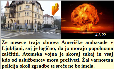 Zločinski projekt v rokah Bidena bo celo mogoče uspel? Ameriško ambasado v Ljubljani temeljito obnavljajo, saj prihaja atomska vojna. Vsaj nekaj malega rezultatov po hudih protestih v Panami. Ne samo mi, tudi nemci bodo pozimi plačali trojno ceno plina za ogrevanje. Vas motijo milijoni GSO komarjev vrženih v naravo? Mi politiki, najbolj hinavski, moramo svoje znanje srkati čez lužo. Celo pri upokojencih sta si na papirju nasprotni stranki enotni!