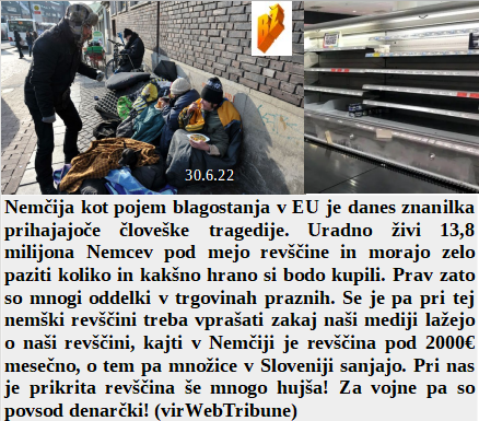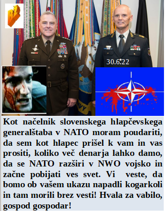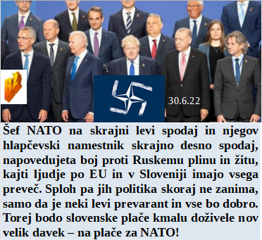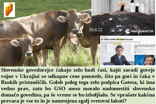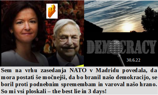 Mi ponosno sprejmemo šefa krvavih akcij po svetu in obljubimo pomoč za ubijanje. Zdaj, ko cepimo kokoši niti ni tako pomembno, da se vsi ljudje cepijo. In Soroš je navdušen nad Fajonovo. Bodo slovenski kmetje zaradi Billa Goloba prenehali z gojenjem krav? In celo nasilna Nemčija je med 13,8% lačnih doma. Na snovanju novih NATO vojn je prisoten tudi naš krvavi poglavar.