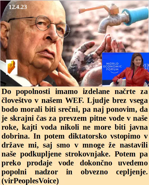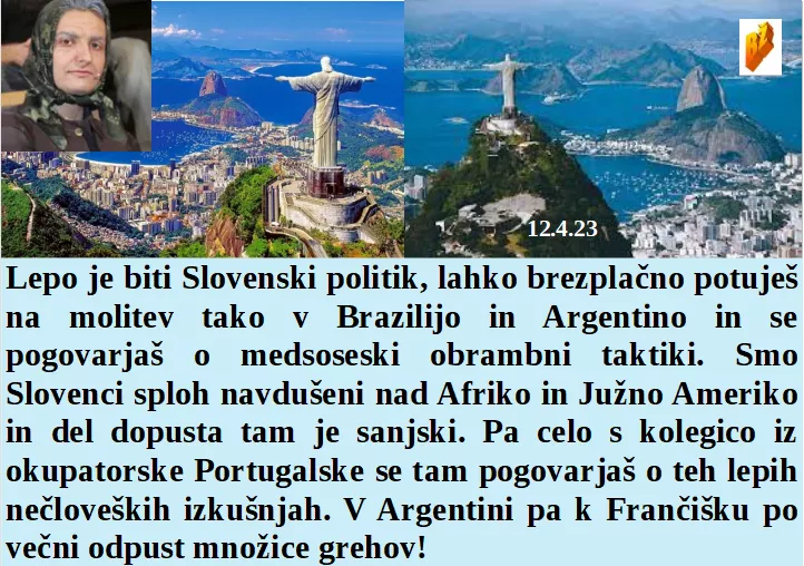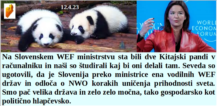 Na našem WEF ministrstvu sta bili 2 Kitajski pandi na obisku, kdo ve zakaj? Ko si Slovenski politik greš tudi v Južno Ameriko lahko zastonj na molitev. Bo Urška sprejela novi 6G praznik, poleg 1.novembra? Smo WEF organizirali kot dobroto, vsa voda bo v naši popolni lasti.