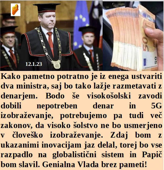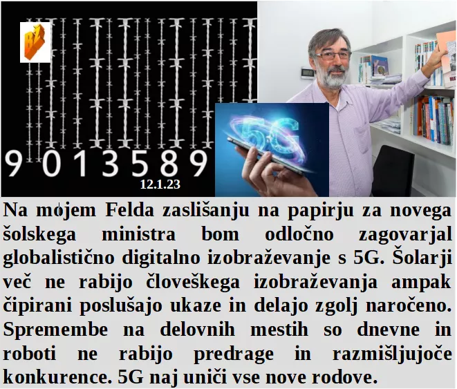 Da bom lahko nov minister za šolstvo bom odločno zagovarjal uničujoči 5G sistem. Javni delavci bi samo stavkali, delo jih ne zanima, saj to delajo delavci. Rabimo zelo veliko ministrov, denarja v državni blagajni je dovolj in treba ga je delavcem še več vzeti. Kot ministrica za javno upravo pa bom sledila že narejenemu načrtu, da bo do leta 2025 vsa Slovenija pod 5G.