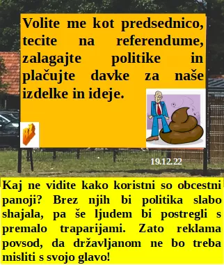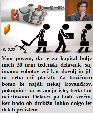 Navdušenje je izjemno, saj so plače mnogo nižje od inflacije in podražitev. Obcestni panoji so idealne norčije in samo tisti, ki kaj pametnega povedo ne sodijo tja. Delati 30 ur je za lastnike kapitala dovolj, vse kar je čez pa imajo brezplačne robote. Zdaj se bo tudi naša vlada ukvarjala s hrano, kot Nizozemska s farmami.