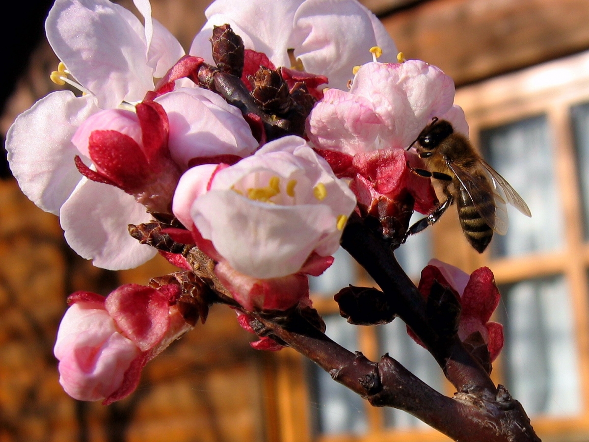 03 Kranjska čebela in cvet Marelice pred točilnico medu v Podnu.