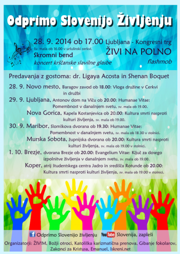 28. 9. 2014: Živi na polno – skupinski ples na Kongresnem trgu v Ljubljani, nagovor o človekovem dostojanstvu, o polnosti življenja po Božjem načrtu, o upanju in sreči, pričevanja, slavilni koncert krščanske glasbe s skupino Skromni bend.