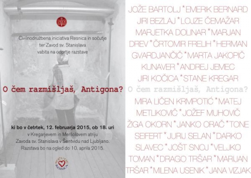 Civilnodružbena iniciativa Resnica in sočutje ter Zavod sv. Stanislava vabita na odprtje razstave »O čem razmišljaš, Antigona?«, ki bo v četrtek, 12. februarja 2015, ob 18. uri v Kregarjevem in Meršolovem atriju Zavoda sv. Stanislava v Šentvidu nad Ljubljano.