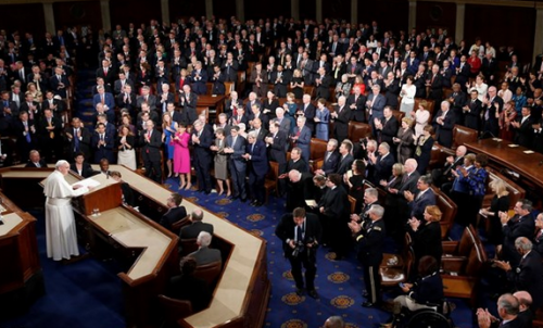 Papež Frančišek je v četrtek, 24. septembra kot prvi papež v zgodovini nagovoril ameriški kongres. Ob 15.20 po našem času ga je na sedežu kongresa sprejel predsednik predsedniškega doma Joe Boehner, s katerim sta se najprej zadržala v zasebnem pogovoru. Zasedanje se je začelo ob 16. uri. Papež Frančišek je spregovoril o pomenu dialoga, pozval k politični odgovornosti, izpostavil teme, kot so tujci, priseljenci in begunci, boj proti revščini, pozval je k ukinitvi smrtne kazni, načel pa tudi vprašanje trgovine z orožjem. Papežev govor so kongresniki večkrat prekinili s ploskanjem.