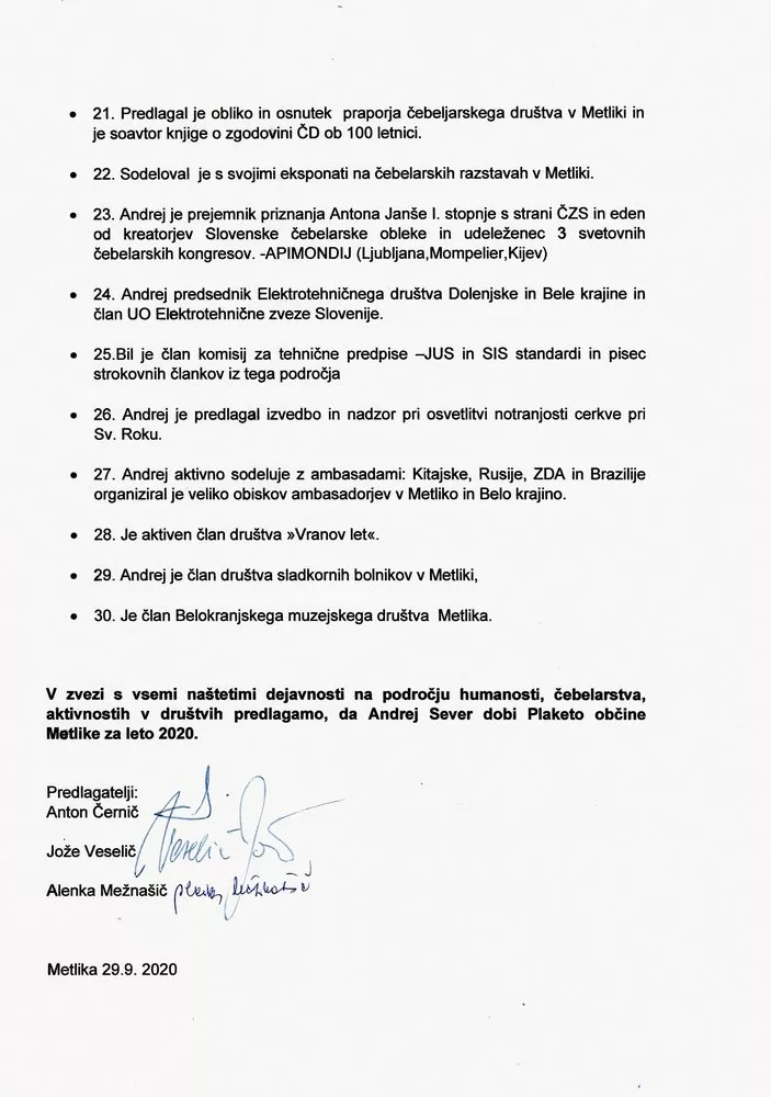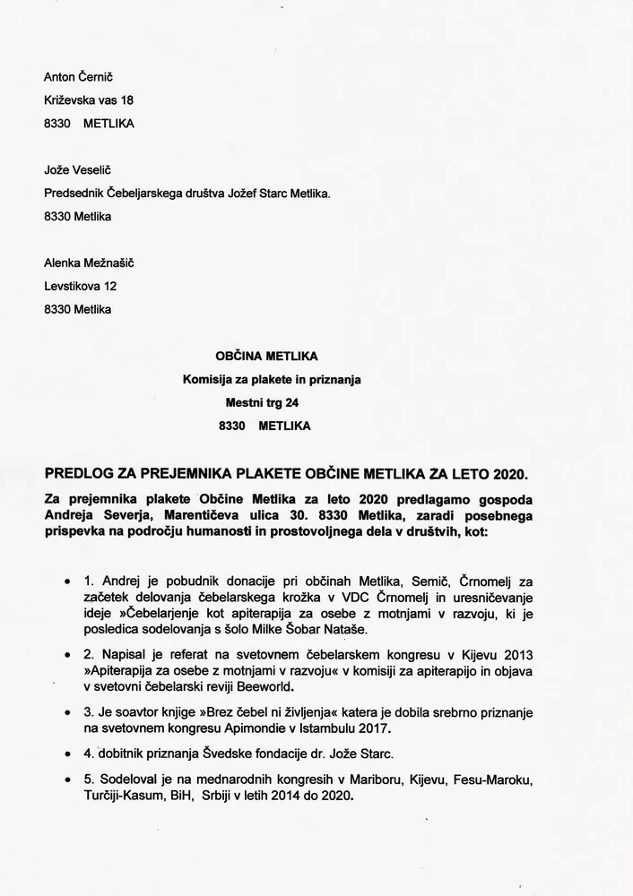Prejemnik plakete Občine Metlika za leto 2020 je Andrej Sever. Plaketo je prejel zaradi posebnega prispevka na področju humanosti in prostovoljnega dela v različnih društvih.