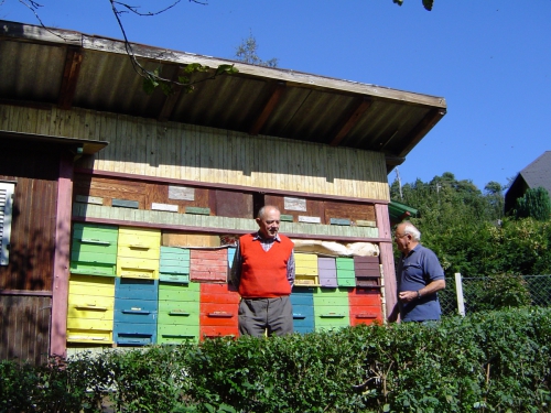 Gospodar in praporščak Jakob ter naš Ivan pred društvenim čebelnjakom