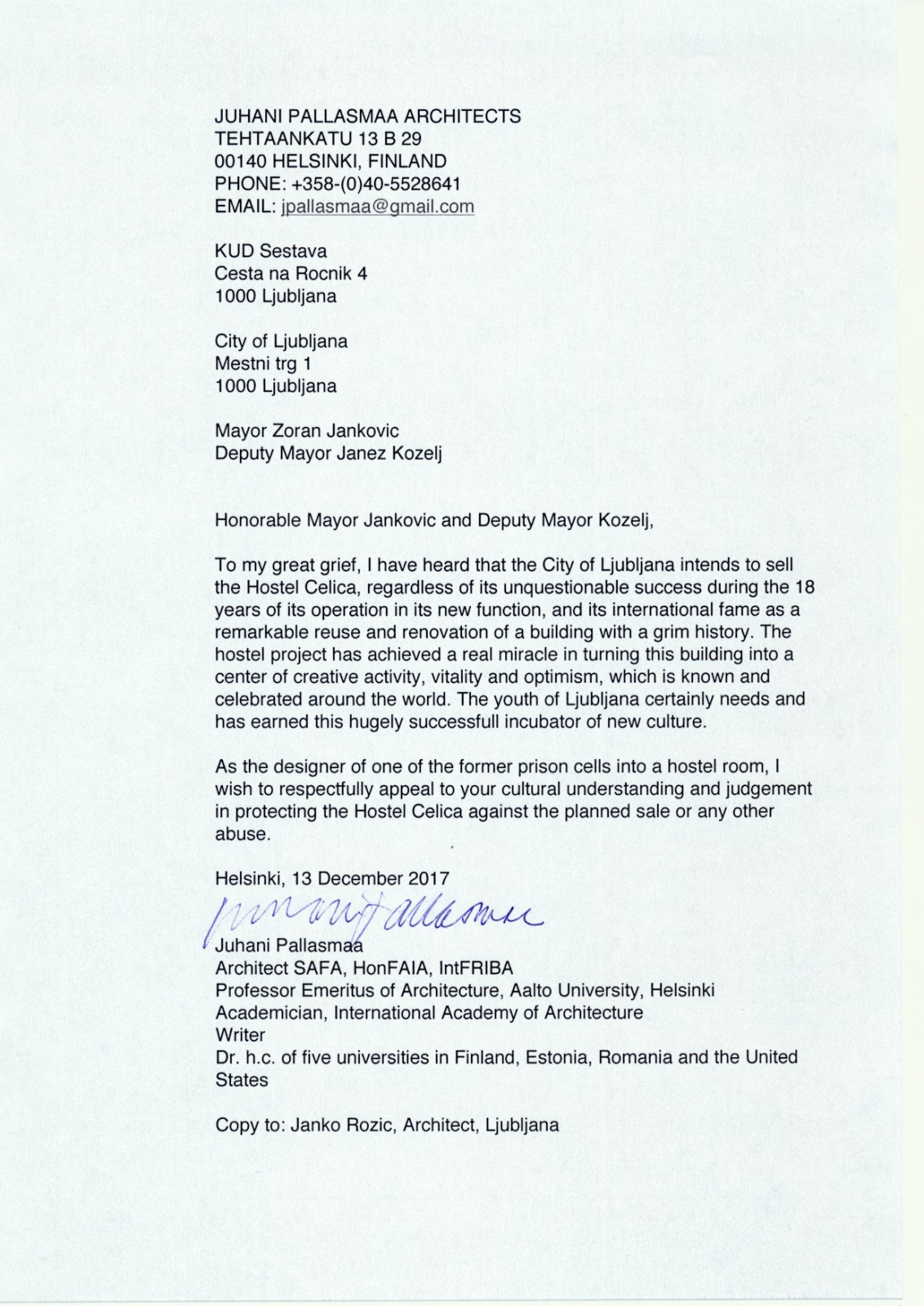 Copy to: Janko Rožič, Architect, Ljubljana
