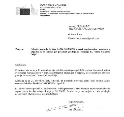 S strani Evropske Komisije smo bili obveščeni, da je Slovenija prejela pisni opomin v zvezi z ravnanjem z odpadki na področju stare Cinkarne in je hkrati uvedla preiskavo o delovanju Cinkarne Celje in njej izdano IPPC okoljevarstveno dovoljenje.