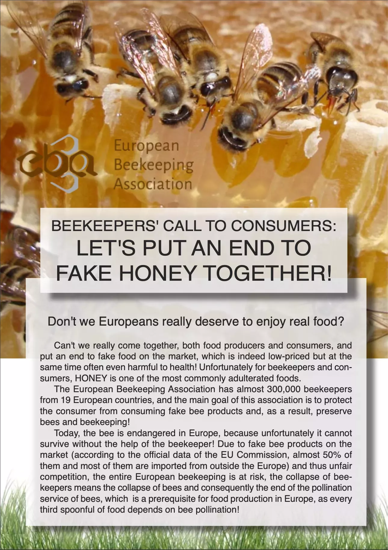 Izvoljeno je novo vodstvo Evropske unije, Evropska čebelarska zveza javno poziva vse evropske poslance, evropske komisarje in druge odločevalce v EU in posameznih državah, naj zaščitijo evropskega čebelarja, zaščitijo evropskega kmeta, ker brez čebel ne bo kmetijstva in za zaščito evropskega potrošnika pred ponarejeno hrano.