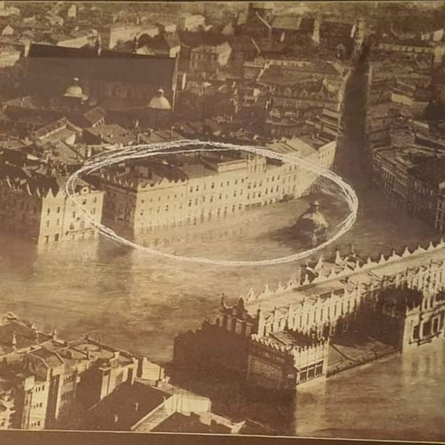 Look closely at this photo taken in 1813! In this photo we can see flooded city of Kraków, a southern Poland city near the border of the Czech Republic, but this flood is not an ordinary flood which can happen after a hurricane or a cyclone, but the flood shown in this photo is much, much bigger than that. Look at how the Main Square building encircled is sunken halfway in the water! The Dome in the middle is almost covered with water!
