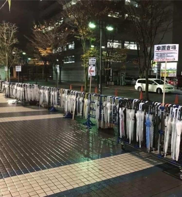Dežniki na stojalu na Japonskem. Če ga rabiš, ga vzameš in pustiš na drugem stojalu.