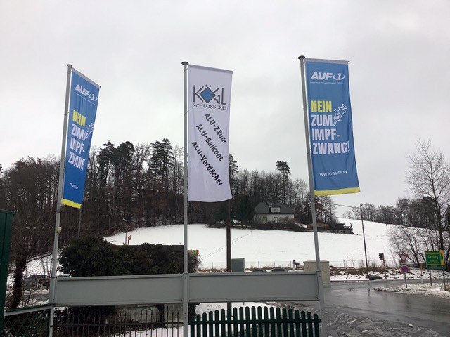 NE OBVEZNEMU CEPLJENJU - napisano na zastavi privatne firme v Nemčiji