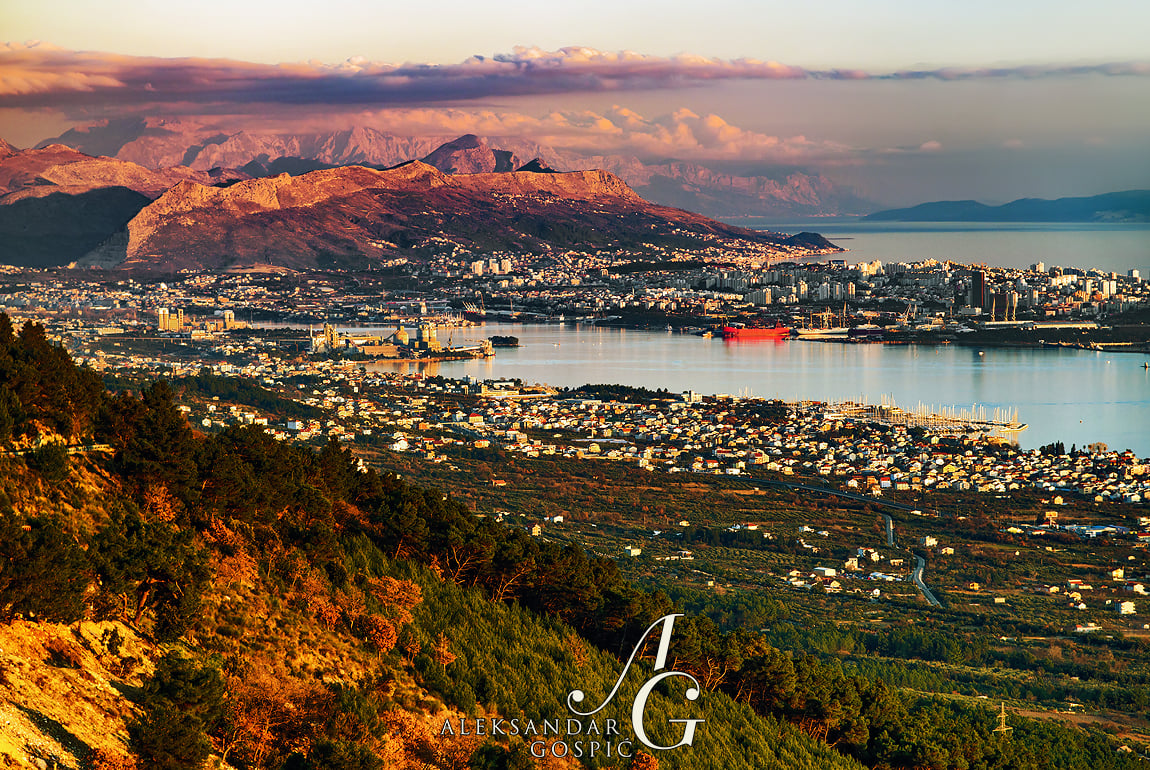 Dan se privodi kraju iznad Kaštela i Splita, dok se u daljini, iza Poljičke Planine i Omiške Dinare, uzdiže zid Biokova zavijen u oblake The day is coming to an end above Kaštela and Split, while in the distance, behind Poljička Planina and Omiška Dinara, rises the wall of Biokovo wrapped in clouds