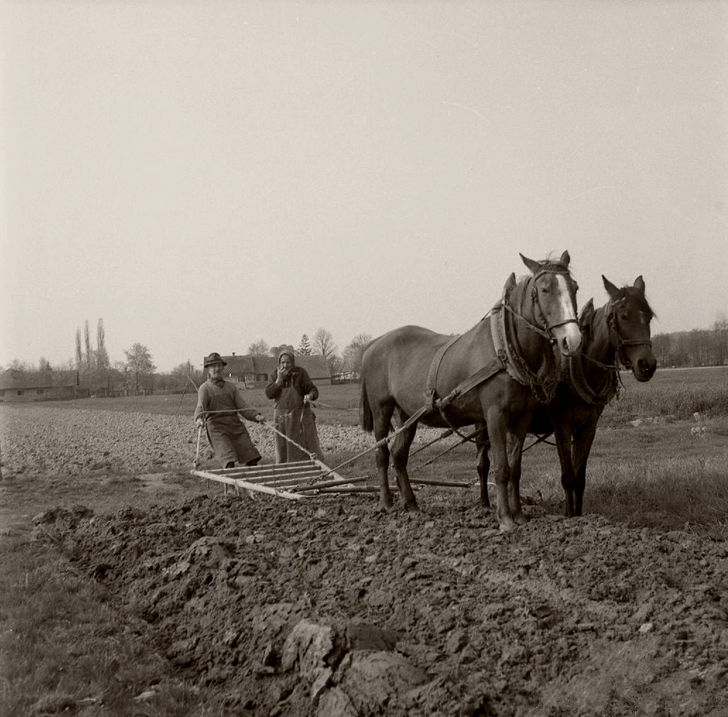 Tak pa je negda zglejala medsosedska pomoč v Bučečovcih - virt Horvat z branami vloči Stajnkovin. Če do razmere s cenami nafte še napre takše, bomo mogoče na našen podeželji opet vidli takše prizore foto: Bučečovci, 1976