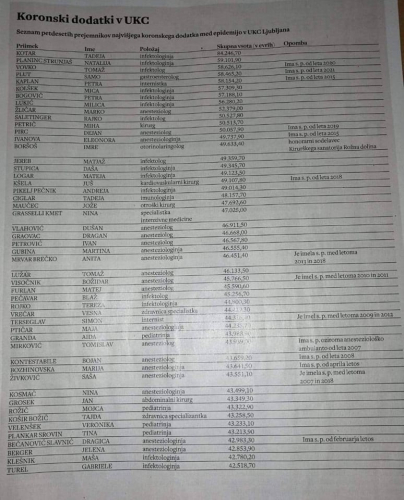 SALETINGER RAJKO infektolog 50.527,80 PETRIČ MIHA kirurg 50.513,70 PIRC DEJAN anesteziolog 50.057,90 Ima s. p. od leta 2019 IVANOVA ELEONORA anesteziologinja 49.737,90 Ima s. p. od leta 2015 BORŠOŠ IMRE otorinolaringolog 49.633,40 honorarni sodelavec Kirurškega sanatorija Rožna dolina JEREB MATJAŽ infektolog 49.359,70 STUPICA DAŠA infektologinja 49.345,70 LOGAR MATEJA infektologinja 49.123,50