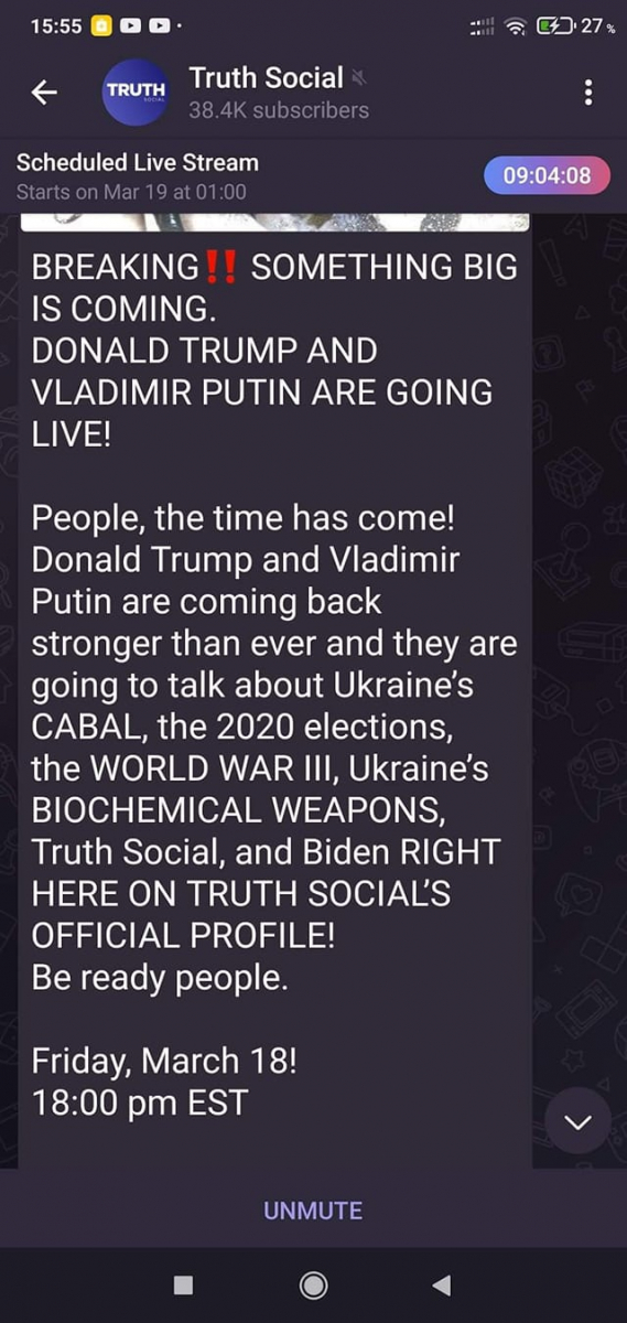 18:00 pm EST! se bosta na novem Telegram Truth Social kanalu V ŽIVO pogovarjala predsednik Trump in predsednik Putin.