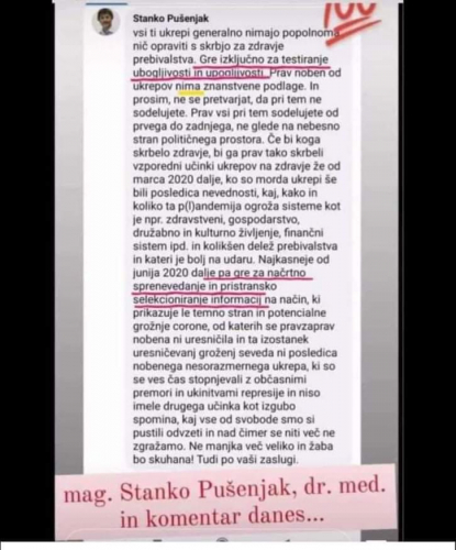 samo za "naše" zdravje "skrbijo" ,tako podmuklih izjav si niti v sanjah nismo predstavljali ,ko smo "ščitili " JJ ,SEDAJ NAM VRAČA Z LJUBEZNIJO ZDRAVSTVENE UKREEPE IN "SKRB"..,KI JE ... NE ... ŽELIMO VSAK JE GOSPODAR SVOJEGA TELESA ,KI MU GA JE POKLONILA NARAVA...NIŽJE NE MORE BIT ...KAM NAS PRIPELJEJO POHLEPNI "PSIHIČI",KI NISO OBČUTILI MATERINE LJUBEZNI ,JE POTEM ŽALOSTNA POSLEDICA NE/ODRASLOSTI...SREČA, NE VSI ..NEKATERIM TRAVMA IZ OTROŠTVA SPREMENI OSEBNOST, POSTANJEO SOVRAŽNI SEBI IN DRUGIM ,ZATO NAS LE. LJUBEZEN V ZAVESTI LAHKO REŠUJE.. TO SE JE MORALO ZGODITI... NARAVA IN "ZAKON VZROKOV IN POSLEDIC",SE NE DA PREPREČITI..."ŠE VINO SE MORA "PRE/ČISTITI ,DA POSTANE PITNO"