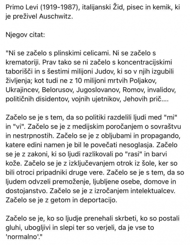 Do kdaj bodo ugotavljali, da je za Svobodo potrebnio narediti vse? Da je potrebno odstranit vlade, predsednike, naciste... in začeti znova! Če želite začeti kritizirat J.B.Tita, sta pri njem in nacistih dva povsem drugačna vzorca! Pri nacistih je v osnovi pridobivanje trga s silo, ukazi, lažjo, pretkanostjo, vojno, jemanjem , tudi grožno s smrtjo, izsiljevanjem! Ljudje in Tito so vse to dosegali s prijateljstvom, sodelovanjem z neuvrščenimi in podobno... Za začetek, to je ena od ljučnih razlik, ... V osnovi gre za temeljno različni stvari! Zato ti naši ljudje nikoli! nikoli več! ne bodo videli čez te planke. Za nas je konec, mogoče kateri od Jugoslovanskih narodov ni še psihično mrtev, a mi zagotovo smo! In v taborišču smo že od tistega sceniranega prihoda migrantov in laži o ubitih, ugrabljenih slovencih... To je res žalostno! Nato so nas ogradili z mrežo, bodečo žico, da ne moremo ven!.... mi smo že v taborišču!
