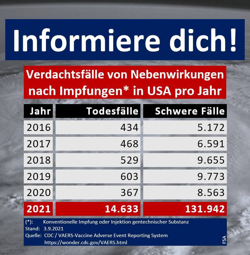 VAERS (Vaccine Adverse Event Reporting System ) ima samo zgolj 1% prijavljenih stranskih učinkov - glede na opravljeno študijo. S tem, da so letos 44.000 smrtnih primerov odstranli iz statistike, češ ker je bla smrt v roku 14-ih dni po cepljenju, da to ni od cepljenja. Tako, mimgrede... So pričanja žvižgačev tudi nekje na internetu, ki jih Facebook tako rad cenzurira.