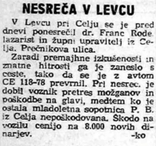 Junija 1966 je počilo. Mlad voznik z Renaultom registrske številke CE 118-78 se je prevrnil na glavo. Zaradi premajhne izkušenosti in znatne hitrosti ga je zaneslo s ceste v Levcu pri Celju. Ime mu je bilo dr. Franc Rode.