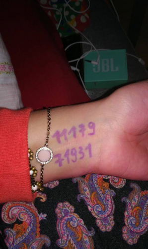 Pogumno naprej! Lahko napišete na roko 71931 - zaščita človeka v vsakem slučaju. Na sliki je roka moje hčerke, ki ima napisana dva niza od grabovoja: 11179 (zaščita med potovanjem) in 71931 (zaščita)