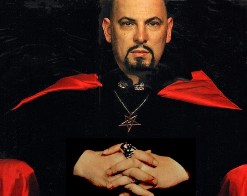 Anton LaVey, ki je sebe imel za čarovnika in visokega svečenika, ter ustanovitelja ”Prve cerkve Satana”, s svojo 3 leta staro hčerko, Zeeno Galateo LaVey med satanističnim ”krstom” v San Franciscu