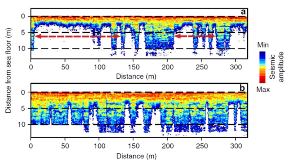 Na akustični sliki iz omenjenega članka je prikazano spreminjanje zgornje meje plina pod dnom morja. Zgoraj je slika leta 2012, spodaj 2011. Plin, ki je kot akustična nejasnost v sedimentu prikazan brezbarvno, se je v istem področju v enem letu ponekod dvignil za 7 do 10 metrov. To nakazuje tudi na razpad permafrosta s spodnje strani, na katero pritiska plin in tako tudi na bistveno hitrejše izginjanje trdnega ščita, kot pa ga povzroča le taljenje z zgornje strani zaradi prevelikega dotoka energije… Prodiranje energije v globino in ogrevanje spodnjih plasti permafrosta, ki sicer še ne popusti, lahko ustvari pogoje, da ga energija (prostega) plina začne hitreje razjedati… Lahko gre pri tem tudi za razširjanje globinskih talikov, območij permafrosta s previsoko temperaturo za obstoj.