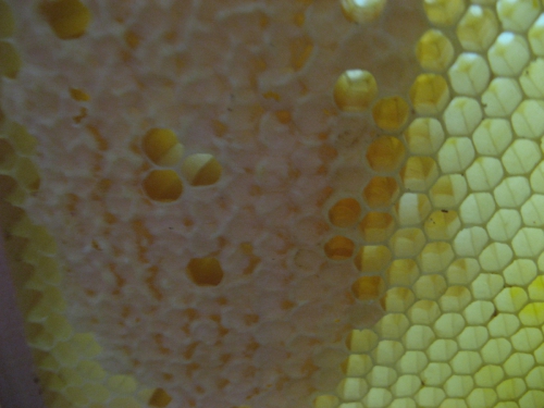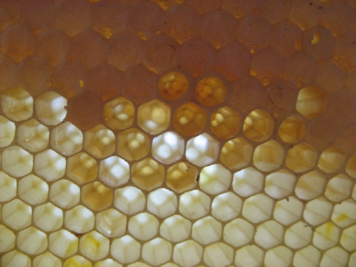 Primerjava starega (temnejši) in deviškega sata (svetlejši) v točilu. Deviški sat je tisti sat v katerem matica še ni zalegala. Z vsakim zaleganjem sat postane temnejši.