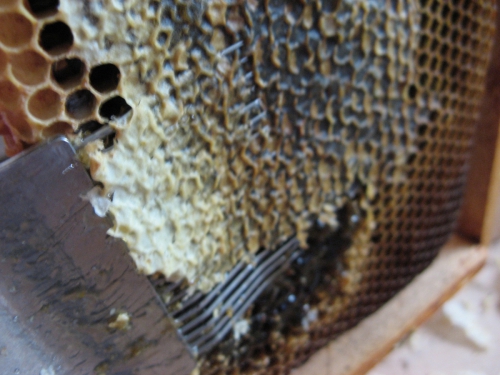 Ne vem, ali veste, vendat na sliki je propolis. Da, to je tista snov, ki je tako zdravilna. Propolisu se reče tudi zadelavina, saj čebele čez zimo "zadelajo" s to snovjo vse špranjice, da jim ne piha in jim je toplo. Propolis je poleti, ki je toplo mehak, pozimi pa se strdi in je trd in lomljiv. Takrat se ga ostrga iz satnic. Seveda ne iz tistih, katere so v panju, ampak tistih, katere imamo zunaj panja. Tak propolis se namoči in tako pridobi tinkturo, katera je tako zdravilna. Pri nas namočimo v alkohol.