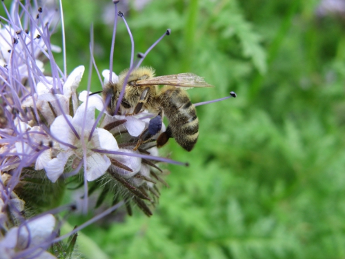 Na sliki se lepo vidi prašnike, ki so lepe vijolične barve, prav tako pa se na čebelji nogici vidi vijolična bunkica. To je cvetni prah, kakor ga čebele prinesejo v panj. Vsaka čebela ima svojo nalogo, ene nabirajo nektar (medičino)/mano, druge hodijo po vodo, tretje pa nabirajo cvetni prah. Nabirajo ga tako, da se s svojim puhastim telesom podrgnejo po prašnikih in nekaj cvetnega prahu ostane na telesu, nekaj se otrese na drugem cvetu na pestič in tako je rastlina oprašena. Ko je čebelje telo polno cvetnega prahu, ga odstrani iz telesa in da na nožico, ter oprašuje naprej. Ko je bunkica cvetnega prahu na nožicah na obeh straneh dovolj velika odidejo v panj. Bunkico cvetnega prahu pa naredijo samo na eni nožici na vsaki strani. Cvetni prah pa čebele uporabljajo za hrano. Kako pa čebelarji dobijo cvetni prah? Poznamo dva načina. En je, da se ga izkoplje iz celice, v katero so ga nanesle čebele. Tako pridobljen cvetni prah ima prav posebno ime, katerega pa se trenutno ne spomnim. Drugi način pa je tak, da za vhodom v panj dajo smukavnik, to so luknje, skozi katere pride prazna čebela ali čebela z medičino oziroma vodo brez problemov, čebelam s cvetnim prahom pa osmuka cvetni prah iz nožic in pade v prostor namenjen za cvetni prah. Čebela je bolj ali manj nepoškodovana. Te vrste cvetni prah se imenuje osmukanec. Razlike v kvaliteti na en in drugi način pridobljenega cvetnega prahu ni. Če pa ne veste še, je cvetni prah zelo zdrav. Obstaja tudi zdravljenje za alergike na cvetni prah s pomočjo cvetnega prahu. Če je človek alergičen na cvetni prah vzame prvi dan eno bunkico in vsak dan nadaljuje z odmerkom, ki je za eno bunkico večji od dneva prej, dokler ne pride na eno malo žličko na dan. Toliko lahko poje vsak človek za zdravje. Če so alergiske reakcije na tak način jemanja premočne, seveda to ni pravo zdravljenje alergije in naj raje s tem preneha. Ker pa nisem noben zdravilec in strokovnjak na tem področju, priporočam, da se pred uporabo takega načina zdravljenja pred uporabo posvetujete s čebelarjem ali pogledate po spletu, vendar zgoraj opisana možnost kolikor vem obstaja in je uspešna.