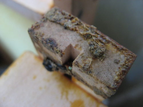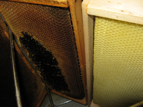 Ne vem, ali veste, vendat na sliki je propolis. Da, to je tista snov, ki je tako zdravilna. Propolisu se reče tudi zadelavina, saj čebele čez zimo "zadelajo" s to snovjo vse špranjice, da jim ne piha in jim je toplo. Propolis je poleti, ki je toplo mehak, pozimi pa se strdi in je trd in lomljiv. Takrat se ga ostrga iz satnic. Seveda ne iz tistih, katere so v panju, ampak tistih, katere imamo zunaj panja. Tak propolis se namoči in tako pridobi tinkturo, katera je tako zdravilna. Pri nas namočimo v alkohol.