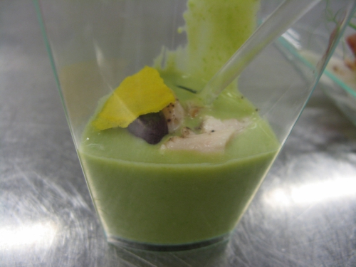 2. skupina je pripravila hladno predjed pod vodstvom Willment Leong z asistentom Juenmeesukom Jatuporenom in sicer Mariniran lososz yuzu holandsko omako, kremni koprc na kumarični in grahovi peni z ikrami, to je fotografija jedi: