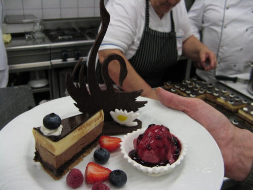 6. skupina pa je že prej pripravila sladico pod vodstvom Jožef Oseli in sicer "Labodji spev", to je Tortica iz bele in temne čokolade, jogurtov sladoled z gozdnimi sadeži in svežimi borovnicami, bila pa je takšna: