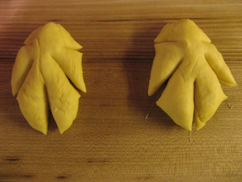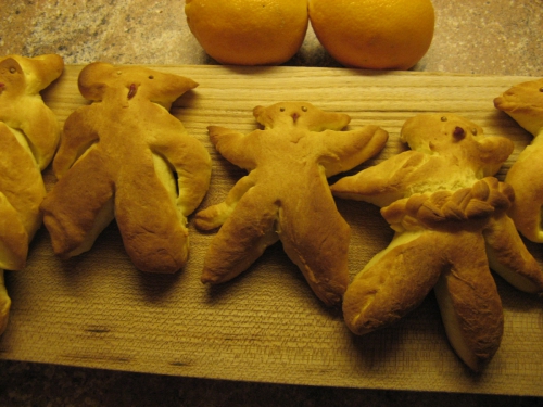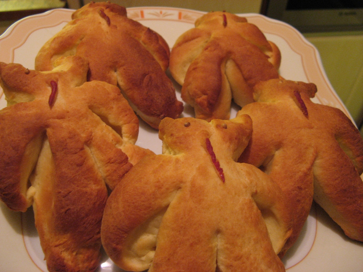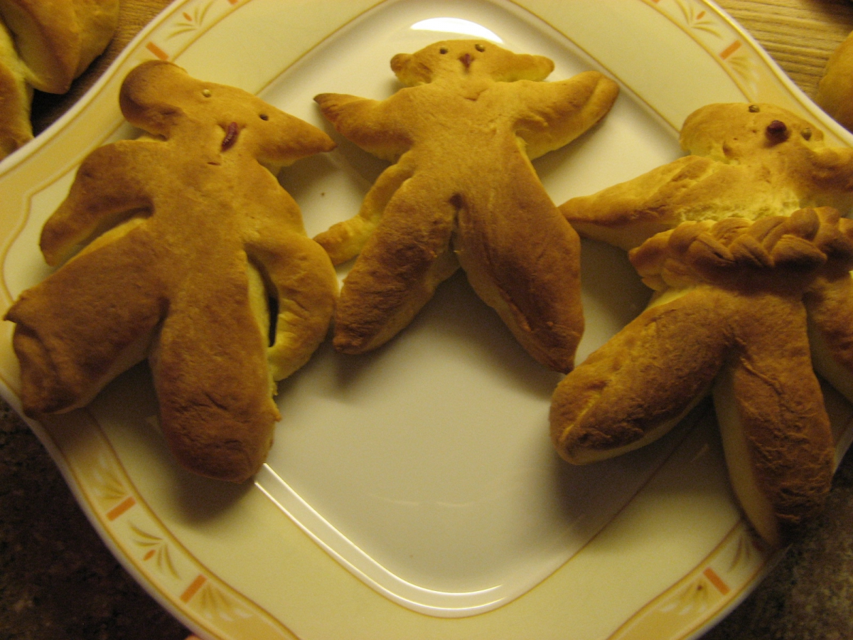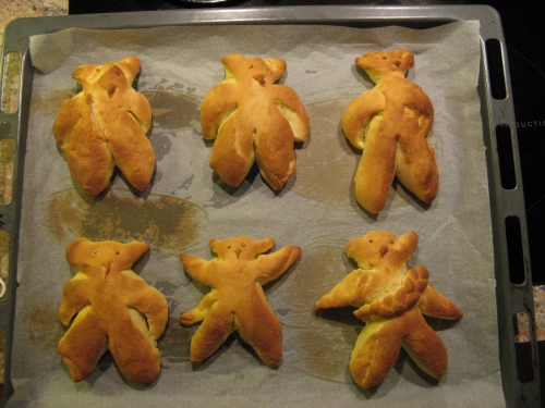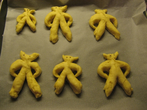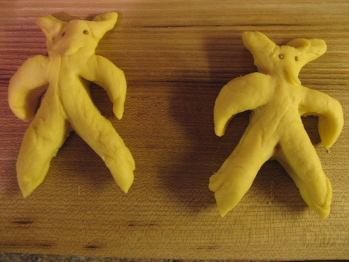 Iz sestavin zamesimo mehko testo (izpustimo sestavine za jezik in oči), ter vzhajamo. Ko vzhaja vzamemo iz testa kepice in oblikujemo v štručko, ki jo 5x zarežemo (glej sliko), ter ušesa (rogove) zavihamo gor, roke in noge pa posvaljkamo, da pridejo daljše in tanjše, ter oblikujemo kakor želimo da ima roke in noge. Parkeljna damo na pekač, zarežemo za jezik, ter dodamo oči. Pustimo, da vzhaja. Pečemo 15-20minut na 180 stopinj celzija. Pečene ohladimo in pobarvamo jezik.
