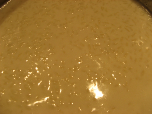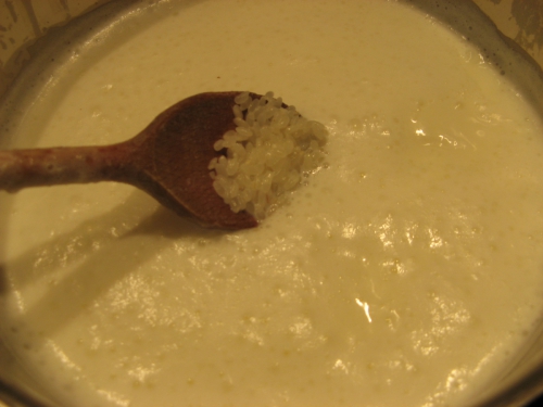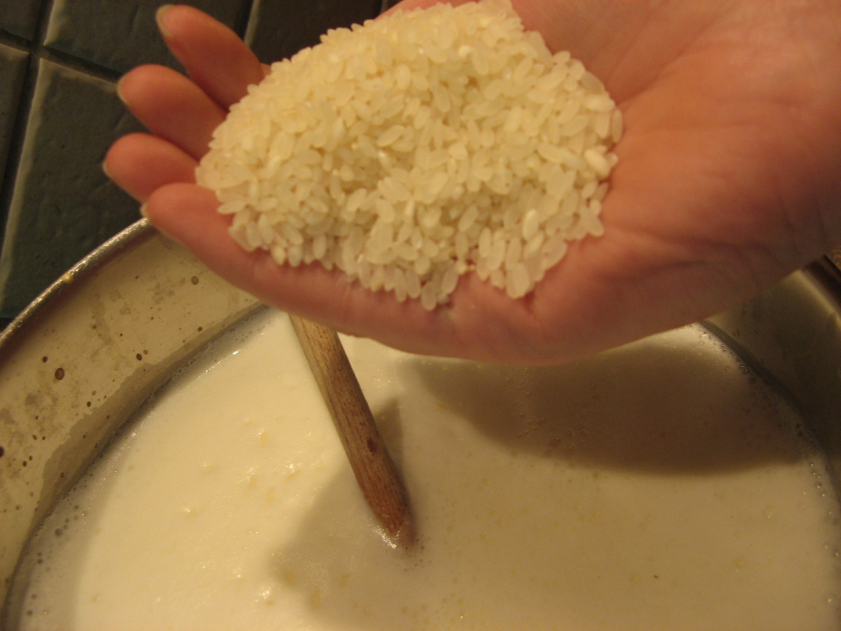 Posodo speremo z vodo, ter jo pustimo v posodi, da razredčimo mleko. Če mleko ni močno ni potrebno dodati vode. Mleko mešamo občasno do vrenja. Ko zavre dodamo sol in sladkor ter riž. Riž skuhamo do mehkega. Kuhanega damo na krožnik in potresemo s kakavom ali čokolado v prahu in ponudimo.