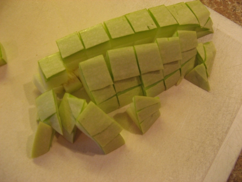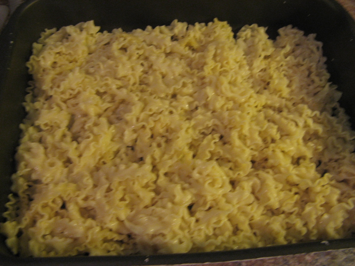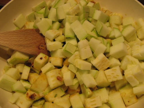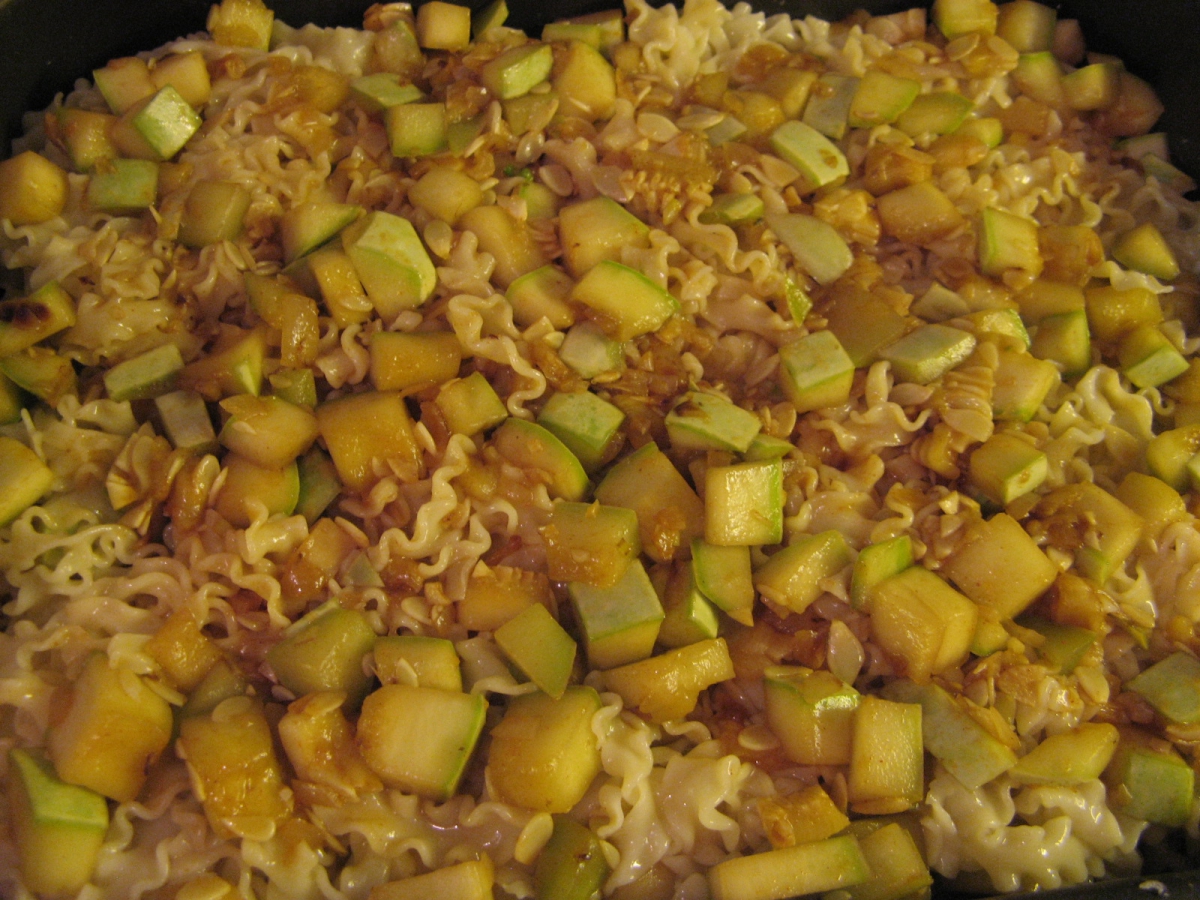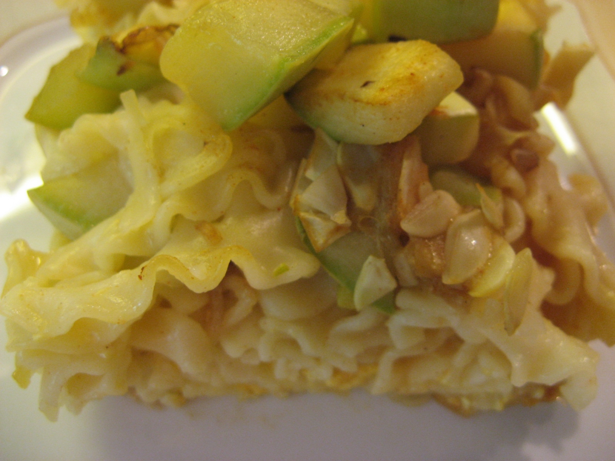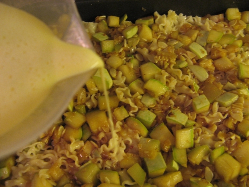 Najprej nasekljaš česen in čebulo, nato narežeš bučko na majhne kocke. Če je bučka mlada je ni potrebno ne lupiti ne odstraniti semen. Segreješ ponev, daš nanjo olje, nato česen in čebulo ter prepražiš. Ko je prepraženo dodaš papriko v prahu. Dodaš tudi bučke ter paradižnikov koncentrat ter prepražiš vse skupaj. Medtem ko pražimo bučke zavremo vodo in v osoljen krop zakuhamo široke rezance. Ko so kuhani damo na pekač najprej rezance, nato bučke. S tem postopkom lahko nadaljuješ, lahko pa narediš samo plast rezancev in plast bučk. V obeh primerih zalijemo z mešanico jajcev in mleka. Pekač damo v pšečico in pečemo 30min na 180 stopinj celzija. Pečeno ponudimo.