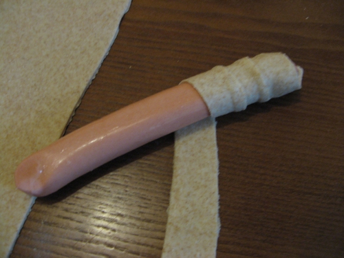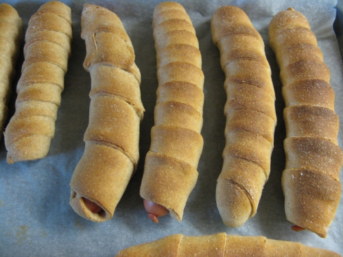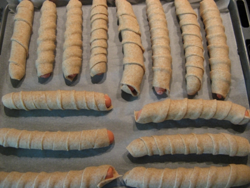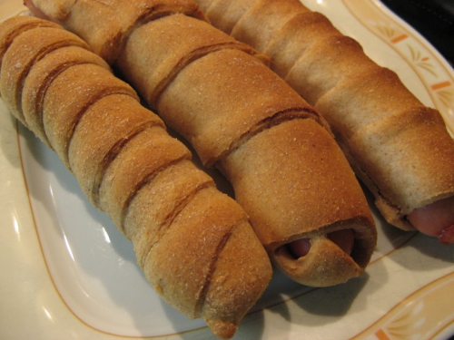 V večjo posodo v kateri bomo zamesili testo damo na dno sol, čez sol moko, v moko naredimo jamico in vanjo nadrobimo kvas, dodamo sladkor, ter zlivamo počasi vodo, ter mešamo, da nastane mehko testo. Na deski da pregnetemo, damo nazaj v pomokano posodo, pokrijemo s kuhinjsko krpo in pustimo, da vzhaja. Ko vzhaja še enkrat pregnetemo, ter pustimo, da vzhaja še enkrat. Ko drugič vzhaja, damo tersto na delovno površino in ga razvaljamo. Z nožem ali čem drugim narežemo na 1-2cm široke trakove in vanje zavijemo hrenovke, ter položimo na pekač. Pustimo, da vzhaja še enkrat, ter damo pekač v vnaprej ogreto pečico na 180 stopinj Celzija in pečemo pol ure, oziroma dokler testo ne postane zlato rjavo. Pečene ponudimo. Dober tek!